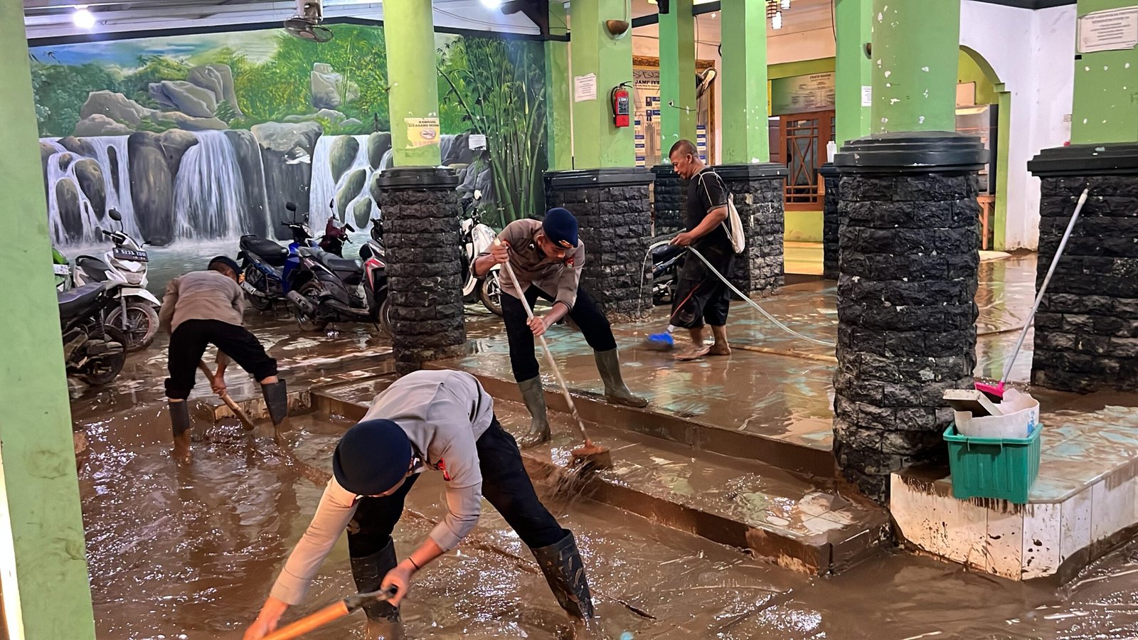 Dengan menggunakan alat seperti pengki, cangkul, sekop, dan sapu ijuk, para personel Brimob bekerja sama membersihkan lumpur yang menutupi rumah-rumah warga.