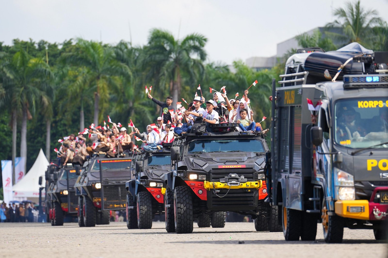 Dalam pantauan langsung di Monas, terlihat ada penerjun Polri yang membentangkan kain besar bergambar Presiden Prabowo Subianto.