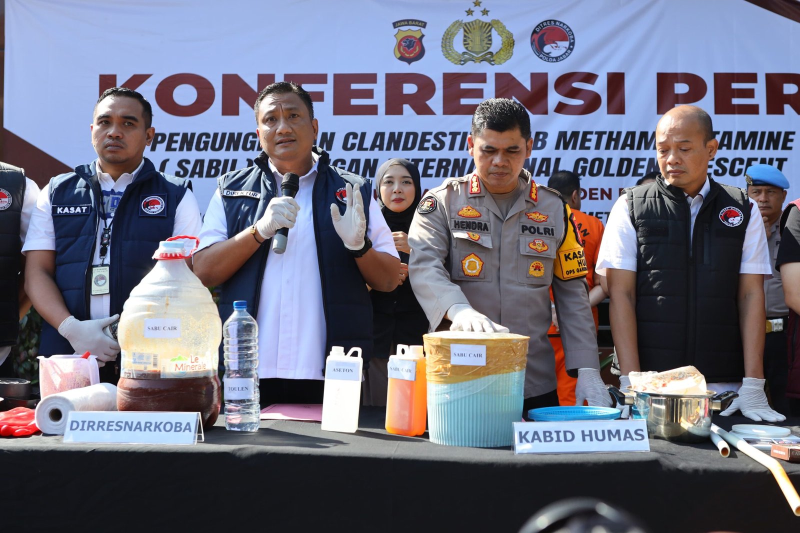 Kombes Pol. Hendra mengatakan, tim penyidik mengamankan barang bukti berupa dua drum cairan diduga sabu cair, satu galon air mineral berisi cairan diduga sabu cair, empat botol kecil berisi cairan toulen, dan botol kecil cairan aseto serta beberapa barang bukti lainya.