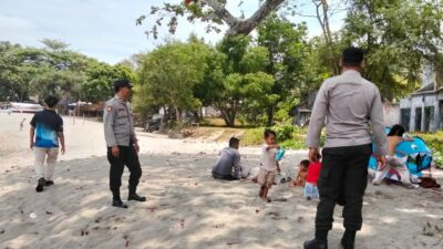 Selain berpatroli, personel kepolisian juga aktif memberikan himbauan kepada para pengunjung pantai. Pesan yang disampaikan sangat sederhana namun krusial: tetap waspada dan berhati-hati.