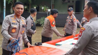 Jakarta. Polri melalui tim Detasemen Perintis turun langsung melakukan evakuasi membantu korban banjir di Bekasi dan Depok. Mereka berpatroli