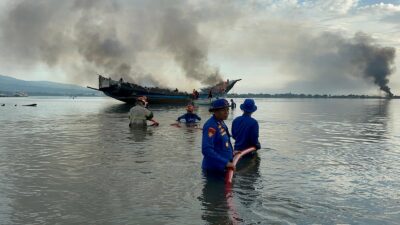– Polairud Polda NTB Bantu Tangani Kebakaran Kapal di Perairan Lombok Timur – ** – Kapal Wisata Terbakar di Teluk